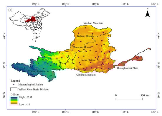 The Yellow River Basin (YRB) is located between 32° N–42° N and 96° E–119° E. It begins from the Bayan Har Mountains in the west and flows to the Bohai Sea, starting from the Yin Mountain in the north and stretching to the Qinling Mountains (Figure 1a). The terrain of the basin gradually declines from west to east. To the west are the headwaters of the river basin, which consists of a series of high mountains averaging more than 4000 m above sea level. To the north is the Inner Mongolian Plateau, with elevations ranging from 1300 to 2200 m. The northern side is bordered by the Yin Mountains, while the western side is the Helan Mountains. In the middle, there are some fragmented basins and the Ordos Plateau. The central region is the Loess Plateau, with elevations ranging from 1000 to 2000 m. The dominant landform is loess-covered tablelands and hills, which suffer from significant soil loss. The downstream area is the Huang-Huai-Hai Plain, characterized by lower elevation.