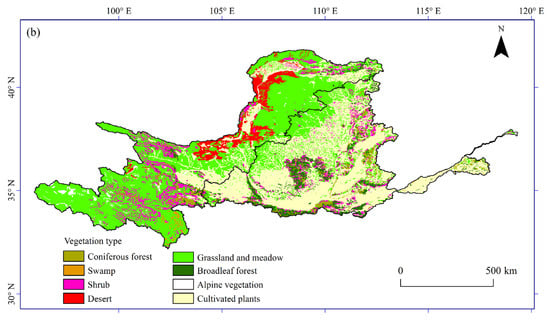 Typical arid, semi-arid, and alpine regions exist in the study area. Regional temperature variations are significant, and the spatial distribution pattern is low in the northwest and high in the southeast. These landforms and climatic features determine regional variations in vegetation types and coverage (Figure 1b). The river source region is controlled by low temperatures and dominated by alpine vegetation, including alpine shrubs, alpine meadows, alpine grasslands, marshes, and aquatic vegetation. The Loess Plateau is characterized by forests and grasslands as the dominant vegetation types, and it gradually transitions from grasslands in the west to forest-steppe.
