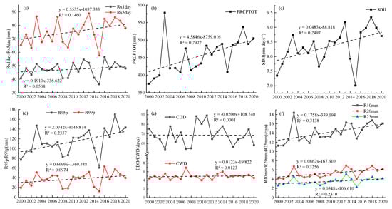 Temporal variations in the 11 extreme precipitation indices (a–f). The black dotted line represents the trend of the variable during 2000–2020.