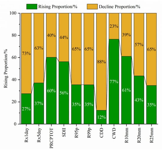From Figure 3, it was found that 27.43% of the area of Rx1day had an increasing trend, and 72.57% had a decreasing trend. A total of 37.13% of the area of Rx5day increased, and 62.87% of the area decreased. PRCPTOT exhibited an upward trend of 60.19% and a downward trend of 39.81%. The areas where Rx1day and PRCPTOT exhibited a remarkable increasing trend were mainly located in the downstream Huang-Huai-Hai Plain, while the regions with an upward trend for Rx5day were primarily found in the western upstream and northeastern regions but not significantly (Figure 4a,c). A total of 56.31% of the area of SDII exhibited an upward trend, but this trend was significant. R95p and R99p showed decreasing areas of 64.51% and 64.56%, respectively, located in the upstream eastern and midstream, while the increasing areas accounted for 35.49% and 35.44%, mainly located in the downstream eastern (Figure 4e,f). This indicated that extreme precipitation intensity has increased in the upstream western and downstream over the past 21 years, while it has decreased in the upstream eastern and midstream.