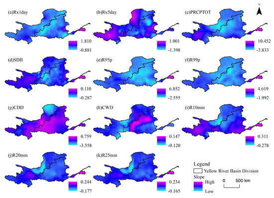A total of 87.61% of the CDD districts decreased, and only 12.39% had an increasing trend, while 23.46% of CWD districts decreased, mainly located in the upstream central region, and the increased area reached 76.54% and was widespread throughout the basin (Figure 4h). The areas with increasing trends in R10mm, R20mm, and R25mm accounted for 61.12%, 43.45%, and 34.78%, respectively, and were found in the upstream western, midstream southern, and downstream regions (Figure 4i–k). The areas with decreasing trends accounted for 38.88%, 56.55%, and 65.22%, respectively, and were concentrated in the upstream central.