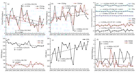 Temporal variations in the 14 extreme temperature indices (a–f). The black dotted line represents the trend of the variable during 2000–2020.
