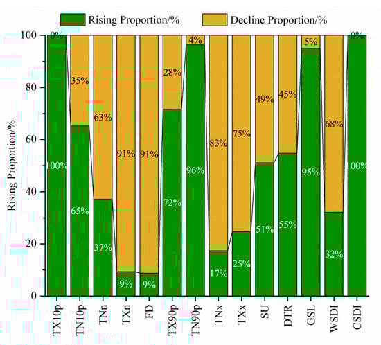 Figure 6 shows that the proportions of TX10p and TN10p regions with an increasing trend reached 99.998% and 65.24%, respectively, while the values for decreasing regions were only 0.002% and 34.76%. The proportions of TX90p and TN90p regions with an increasing trend were as high as 71.62% and 96.37%, respectively, while the values for decreasing regions were only 28.38% and 3.63%. The areas with decreasing TNn and TXn values accounted for 63.88% and 90.70%, while the areas with increasing values accounted for 37.12% and 9.30%, respectively. The areas with decreasing TNx and TXx values accounted for 82.76% and 75.34%, while the areas with increasing values accounted for 17.24% and 24.66%, respectively. The areas with decreasing FD values accounted for 91.29%, while the increasing values reached 8.71%. The decreasing SU values accounted for 48.90%, while the areas with increasing values accounted for 51.10%. The expansion of areas with extreme cold and warm temperature values indicated a progressive growth in extreme temperatures (Figure 7a–j). The spatial trend of the DTR exhibited significant distribution differences, with the increase and decrease accounting for 54.74% and 45.26%, respectively.