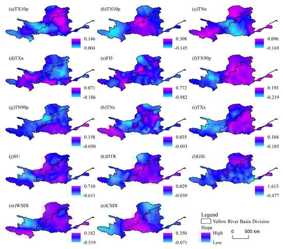 Spatial distribution of the 14 extreme temperature indices from 2000 to 2020 in YRB.