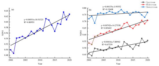Trend of annual maximum NDVI changes in the (a) YRB and (b) three subbasins from 2000 to 2020.