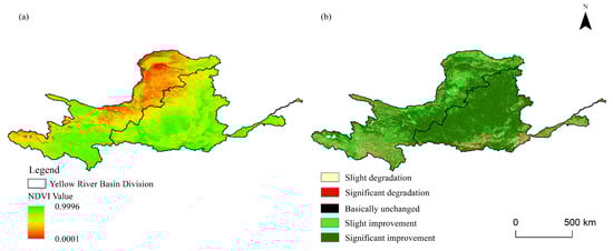 In terms of spatial distribution, the annual average NDVI values were higher in the west of the upstream, the central-southern regions of the midstream, and the downstream areas. However, they were lower in specific areas of the upstream, such as the high-altitude areas of the Tibetan Plateau, the Kubuqi Desert, and the MaoWusu Desert (Figure 9a). Concerning spatial change trends, the annual average NDVI demonstrated an overall growth trend, with improvement and degradation areas accounting for 87.33% and 12.63%, respectively (Figure 9b). The Loess Plateau region in the midstream of the YRB had remarkable growth, indicating notable success in ecological restoration of vegetation over the 21-year period. Conversely, areas facing severe degradation were primarily concentrated in the southern part of the midstream and downstream regions. This might be due to the high population density of the region, which made vegetation susceptible to influence from human activities. Additionally, urban expansion has transformed certain agricultural lands and grasslands into construction sites, leading to a certain degree of vegetation degradation. To promote ecological and environmental restoration, it will be necessary to intensify green vegetation construction efforts in these regions in the future.
