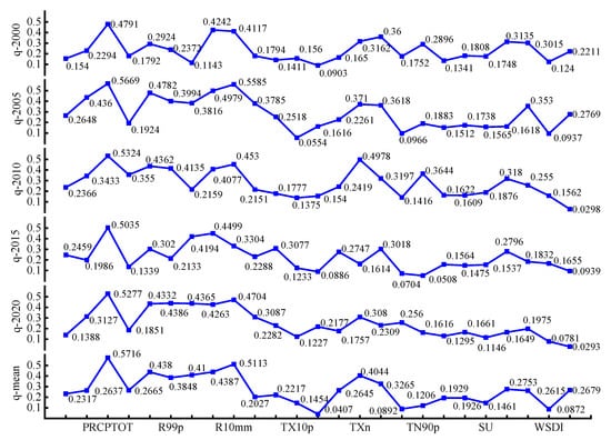 q-value changes of 25 extreme climate indices on NDVI in the YRB over 6 periods (2000, 2005, 2010, 2015, 2020, and overall mean).