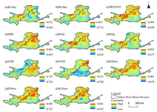 The correlation between the extreme precipitation indices and the annual NDVI during 2000–2020 in the YRB.