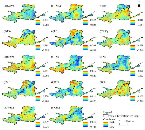 The vegetation response to climate change may be more pronounced under extreme climate conditions. Existing research has also indicated a significant link between vegetation cover and ECE, especially in semiarid and arid regions. Therefore, there is a need to deeply explore the response mechanisms between ECEs and vegetation. Figure 11 and Figure 12 show the Pearson correlation analysis results with the NDVI and raster images generated from the 25 extreme climate index data calculated by the RClimDex1.1 software for 86 meteorological stations after interpolation by kriging.