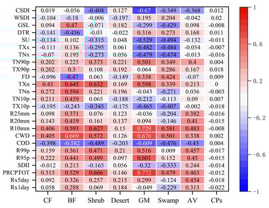 From Figure 13, it was found that the highest positive correlation between EPIs and the NDVI occurs in grassland meadows, broadleaf forests, and shrub areas. The maximum positive correlations in these three regions were 0.772, 0.669, and 0.666, respectively, while the highest negative correlations were 0.609, 0.582, and 0.489. Among the correlations, the impacts of PRCPTOT and CDD on the NDVI were the most significant. The extreme temperature index TXn exhibited the highest positive correlation with the NDVI in the three major regions, with values of 0.598, 0.645, and 0.632. Correspondingly, the highest negative correlations were 0.67, 0.47, and 0.408, where the influence of CSDI on the NDVI was relatively important. However, in desert and cultivated vegetation areas, the correlation between changes in EPIs, ETIs, and the NDVI was relatively low. This is due to the lower vegetation coverage in deserts, where vegetation changes are less affected by environmental variations. On the other hand, cultivated vegetation was actively managed within the scope of human activities, leading to reduced natural impacts on vegetation.
