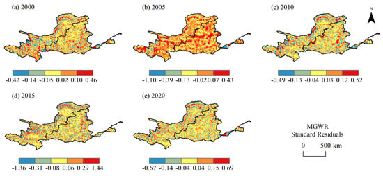 The spatial distribution of the MGWR standard residuals from 2000 to 2020. (a) Phase 1, 2000; (b) Phase 2, 2005; (c) Phase 3, 2010; (d) Phase 4, 2015; (e) Phase 5, 2020.