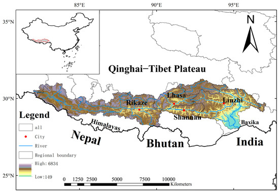 The Yarlung Tsangpo River basin is situated between the southern part of the Qinghai–Tibetan Plateau and the northern foothills of the Himalayas (27° N–32° N, 82° E–97° E) (Figure 1). Spanning an average altitude of over 4000 m above sea level, it covers an area of approximately 240,000 km2 in China, boasting an annual runoff exceeding 160 billion m3. Flowing through regions such as Rikaze, Lhasa, Shannan, and Linzhi, and eventually exiting China through Baxika, the Yarlung Tsangpo River basin holds significant geographical importance. Because of its location in the plateau area, the basin exhibits distinct stratification characteristics in its underground composition. Moreover, it is less influenced by human activities compared to other regions. Therefore, this study selected the Yarlung Tsangpo River basin as the research focus for investigating climate and vegetation changes in the alpine region.