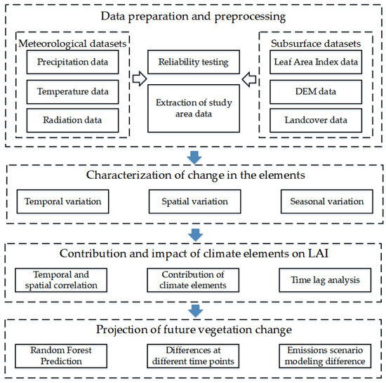 Existing research results indicate that precipitation, temperature, and solar radiation are the climatic factors that have the greatest impact on the LAI [57,58,59,60]. In general, temperature exerts a significant impact on high-latitude and high-altitude areas, whereas precipitation plays a noticeable role in arid and semi-arid regions, and solar radiation is a crucial source for plant growth. Therefore, this study primarily focuses on these three indicators as the research objects for investigating changes in the LAI. The sensitivity and contribution of each meteorological factor to vegetation changes were assessed using the following methods: