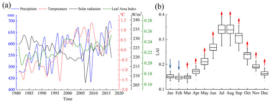 Inter- and intra-annual variation in the LAI: (a) annual variation in the LAI and meteorological factors; (b) annual distribution of the LAI (blue arrows represent a decrease, and red arrows represent an increase).