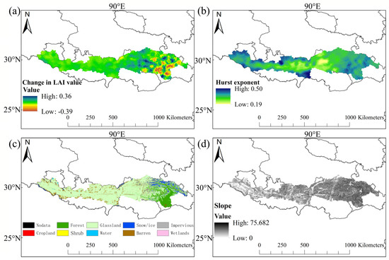 Spatial variation in the LAI and subsurface elements in the Yarlung Tsangpo River basin: (a) spatial variation in LAI; (b) Hurst exponent of monthly LAI; (c) land use in the study area; (d) slope of the study area.