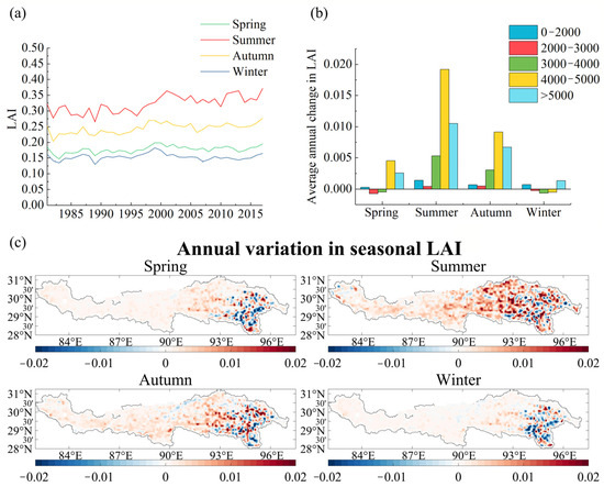 Seasonal variation in the LAI: (a) interannual variation in seasonal LAI; (b) elevation differences in the amount of seasonal variation; (c) spatial variation in seasonal changes.