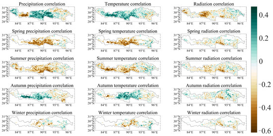 In the context of regional relationships, the most notable correlation between the LAI changes and climate change is observed in the grassland areas in the middle reaches of the basin. However, the correlation with climate change is limited in the wildland, glacier, and permafrost areas in the upper reaches of the basin, as well as the woodland areas in the lower reaches of the basin. Positive correlations are concentrated in the grassland and woodland areas in the middle and upper reaches of the watershed, whereas negative correlations are observed in the lower reaches. The changes in the LAI indicate that temperature and precipitation play a significant role in the development of grassland in the Yarlung Tsangpo River basin, while reduced radiation negatively impacts the vegetation cover in the woodland areas. In terms of the different vegetation types, the grassland LAI has a higher correlation with precipitation, while the other vegetation types have a higher correlation with temperature, and radiation has a higher correlation basically only with the more densely vegetated downstream woodland areas.