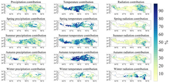 Figure 7 illustrates the contribution of the three climatic factors to the change in the LAI from 1981 to 2017 at both interannual and seasonal scales. The results show that of the three climate factors, temperature contributed significantly to the change in the LAI in most parts of the basin. Especially noteworthy is the grassland-covered areas in the upper and middle reaches of the basin. The contribution of precipitation to the change in the LAI is primarily concentrated in the woodland-covered areas in the lower part of the basin and in certain grassland areas in the upper and middle reaches of the basin; the contribution of radiation to the change in LAI is more concentrated, with a more significant effect only in the woodland areas in the lower reaches of the basin. From a seasonal perspective, the contribution of temperature was significant in spring, summer, and autumn, covering most of the basin. In winter, this contribution decreases and is only sustained in the middle reaches of the basin. During the spring and summer, precipitation contributes to vegetation changes in the grassland areas in the central part of the basin. In the autumn and winter, this contribution is concentrated in the upper and lower parts of the basin, with a diminishing impact on grassland areas. Radiation maintains the same distribution and contribution as the interannual contribution in the spring, summer and autumn, but in the winter the influence of solar radiation starts to increase significantly, exceeding the contribution of precipitation and temperature in most parts of the basin, and the more south, the more pronounced this phenomenon becomes. Analyzed from the point of view of the type of vegetation, the closer to the lower reaches of the area with more woodland cover, the higher the contribution of the solar radiation, and vice versa, the higher the contribution of the temperature, which is due to the different perspectives of the two types of vegetation in terms of the demand for climatic factors in the process of growth, with woodland having a much higher demand for solar energy than grassland, which relies more on the changes in the growing environment brought about by the air temperature.