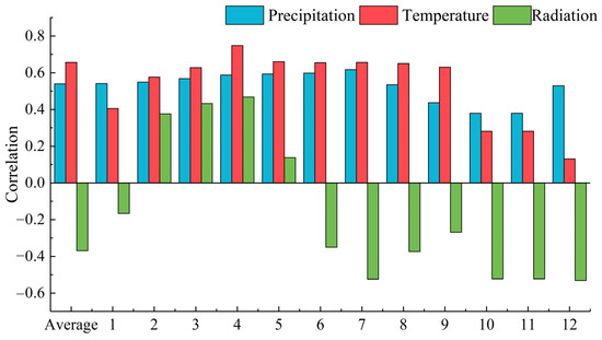 It can be seen from the results of the annual mean that the two elements of precipitation and temperature have a positive correlation with the LAI, while radiation indicates a negative correlation, but with the exclusion of the monthly mean, the correlation between climate factors and the LAI begins to change in a different manner. The correlation of precipitation remained stable, but the correlations of temperature and radiation with the LAI began to change, with a decrease in the serial correlation of temperature when the winter and spring months were excluded and a significant increase in the correlation coefficient of radiation when the spring months were excluded. This observation may be associated with alterations in the regional vegetation growth environment resulting from changes in the winter temperature and the time lag in the vegetation growth process across different elevation zones.