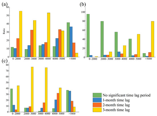 It can be seen that there is a lag in the vegetation for all three factors during the growing season, and there is a clear stepwise difference in the performance at different elevations. The vegetation growth at the low and middle elevations had a more obvious lag effect on the precipitation, and in the area below 4000 m, the three-month lag period was more than 50%. However, this situation was reversed in the high-elevation area, and the proportions of the three lags in the grassland environment between 4000 and 5000 m gradually converge. The lag effect of the LAI on the precipitation was gradually eliminated in the region above 5000 m. The time lag of the LAI on the air temperature was opposite to that of the precipitation. In the region below 4000 m, the LAI had no obvious lag effect on the air temperature, while in the region above 4000 m, the lag effect gradually began to manifest, and in the region above 5000 m, the lag was the most significant. The hysteresis of the radiation was greater in the middle-altitude area of the basin, and the hysteresis was most significant in the area of 2000–4000 m, which gradually weakened when the altitude increased or decreased.