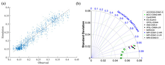 Simulation reduction results for different climate models using the random forest model: (a) scatterplot of measured and simulated results; (b) Taylor diagram for different climate models.