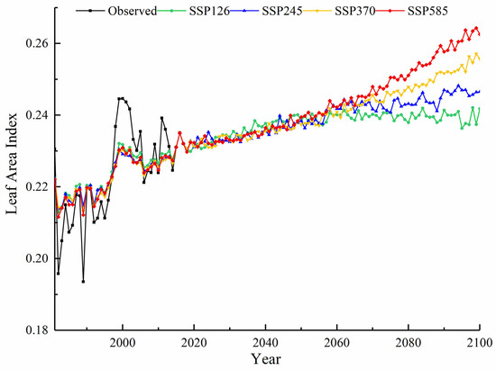 The interannual variation in the LAI in the Yarlung Tsangpo River basin from 1981 to 2100.