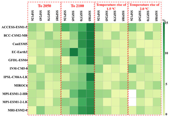 To analyze the change in the LAI at different future time points, the rates of change in the LAI for each of the 11 climate models at four main time points were analyzed and compared using four scenarios. The time points were the near-future period (to 2050); far-future period (to 2100); temperature rise of 1.5 °C; and temperature rise of 2.0 °C. The results of the changes under the different models are illustrated in Figure 7. Analyzing the four major time points of change under the four scenarios, it is observed that the SSP126 scenario exhibited the smallest overall change in the LAI. The increase in the LAI remained at around 3% up to the near-future period (2050), specifically at the time point of a 1.5 °C warming. The overall change in the LAI at the time point of a 2.0 °C warming increased but remained insignificant and did not reach 2.0 °C warming in two models. The change to 2100 is the largest of the four time points, but the overall percentage increase did not exceed 5%. The SSP245 scenario had similar results to SSP126 for the 2050, 1.5 °C, and 2.0 °C time points, but there was some variation at the 2100 time point, with the overall rate of change ranging from 6% to 10, with the EC-Earth3 model, in particular, showing the most significant change. SSP370 and SSP585 were similar in performance, with growth rates remaining at 3%–5% at the 2050, 1.5 °C, and 2.0 °C time points, but SSP585 had an extremely pronounced increase at the 2100 time point, with an overall change of 10%–15%.