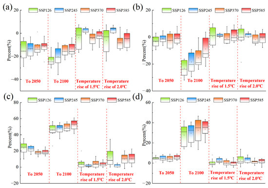 It can be seen that there are relatively obvious differences in the changes in the LAI at different time points in the future for the four seasons, among which the overall decline in spring is within 20%, except for the 2100 time point, and there are obvious differences in the performance of each model. In summer, the LAI is basically unchanged at the remaining three time points, except for 2100. The performance of each model is relatively stable at the four time points in autumn, with the largest increase of 50% at 2100 and 5–20% at the other three time points. In winter, the increase is mainly significant at the time point of 2100, while the changes at the other time points are relatively weak. As can be seen, the seasonal changes in the future LAI are more pronounced in the autumn and winter, with spring being the main season for decreases in the LAI, while summer, when vegetation growth is at its peak, does not show a significant change, which also reflects the trend of a slow increase in the future LAI. The rise in emissions has a stabilizing effect on the change in the LAI in the different scenarios, with the greater the temperature rise, the more pronounced the increase in the LAI.