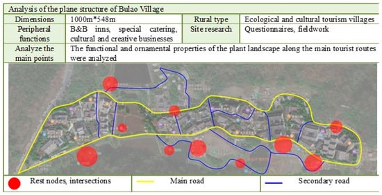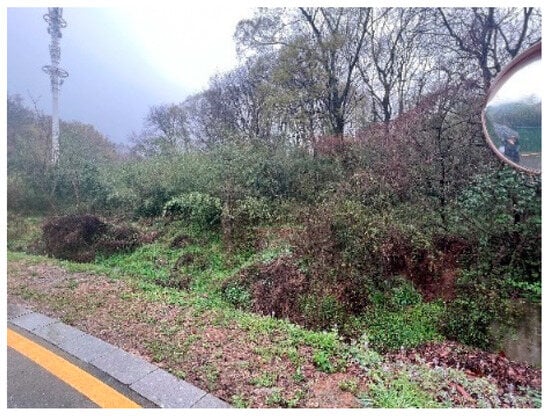 The parking lot near the main entrance of Bulao Village has a rich plant configuration including not only Prunus serrulata, Acer palmatum Thunb, and Malus halliana but also the dominant tree species camphor in the vertical configuration of plants, forming a “big joe-small joe-shrub-herb” model. Its ornamental and carbon sink ability are relatively good (Figure 9). The plant configuration near the parking lot in the east of the village is less aesthetically pleasing, the design space is larger, the current existing terrain in the east is slope-like, and the geographical location is the farthest point on the tour route in the village of Bulao. The degree of plant wilderness is high, which is not in harmony with the overall landscape of the village (Figure 10).