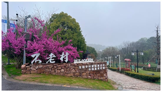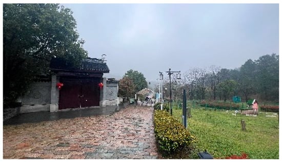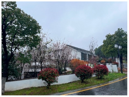 Nanjing, Jiangsu Province, is located in eastern China, in the lower reaches of the Yangtze River (31°14′~32°37′ N, 118°22′~119°14′ E) [41]; it is an essential city in the Yangtze River Delta radiation driven by the planning and positioning of the State Council and is also a critical node city at an intersection position. Nanjing Bulao Village is in Baima Community, Jiangpu Street, in the southern foothills of Jiangsu’s largest national forest park—Laoshan National Forest Park. To the north and south are mountains, and the slight central depression is a mountain valley, rich in water resources. Given this natural environment and geographical location, Bulao Village, as a national rural tourism key village, is among China’s 50 most beautiful villages and towns and Pukou’s top 10 cultural tourism symbols. The forest coverage rate of the village is 80%, and the number of negative oxygen ions in the air is 500 times that in the main urban area. The village is far from the city center but not far from the city, and the travel time is about 1 h; although it is in the middle of the mountains, it is just ten miles away from the bustling city (Figure 1, Figure 2 and Figure 3).