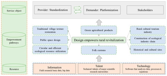 Based on this, this paper constructs the framework of “rigorous, scientific and beautiful design intervention = service object + empowerment path + resource” (Figure 4). The left side of the equation is the essence of the digital design ecosystem, which has changed from patterned and rigid planning to artistic expression and beautiful design intervention. In the countryside, this is reflected in the restoration and innovation of traditional cultural carriers, ecological environment improvement, rural style design, architectural space environment design, public service design, product design, and marketing to achieve rigorous, scientific, and beautiful design interventions. The demander of the system can save their own time, energy, money, and other elements by directly selecting the required information from public data, and the provider of the system can more conveniently and quickly display their resource advantages, including basic information, various professional talents, technical methods in the system, etc.