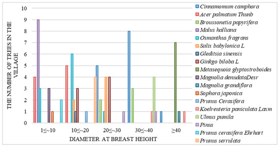 There are 35 species of street trees in Bulao Village, belonging to 22 families and 33 genera, including 19 species of trees, 312 trees, and 16 species of shrubs. Camphor is the dominant tree species among the street trees, accounting for 75.16% of the total, and the dominant species of shrub is heather, accounting for 62% of the total. The breast diameter distribution of the street tree species was divided into five groups (Figure 5); the proportion of trees with a breast diameter of 1–10 cm was 7.99%, the proportion of trees with a breast diameter of 10–20 cm was 7.03%, the proportion of trees with a breast diameter of 20–30 cm was 5.43%, the breast diameter of most trees (76.04%) was between 30 and 40 cm, and the remaining 3.51% of trees had a breast diameter of ≥40 cm. The breast diameters of Malus halliana, Prunus serrulata, Osmanthus fragrans, Magnolia denudata, and Acer are mainly concentrated between 1 and 20 cm, and the tree species with a breast diameter of ≥30 cm are mainly concentrated within the backbone tree species of street trees. Metasequoia glyptostroboides, as a unique plant in China, is also among the first batch of plants listed as having national I protection in China, which is of great significance.