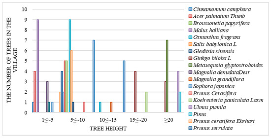 The height distribution of the street tree species was divided into five tree height groups. The tree height distribution of the tree species is scattered (Figure 6). There were more trees with heights of 1–5 m and 5–10 m, accounting for 27.47% and 31.87% of the total, respectively, while 17.58% of the trees had a height of ≥20 m, and these were Metasequoia glyptostroboides. In general, the structure of the height of the street trees in the village is reasonably well distributed, which is in line with the growth law of rural tree species. Malus halliana, Prunus serrulata, Acer, and Osmanthus fragrans with a height of less than 10 m are relatively significant and an integral part of the lower community structure of the street trees in Bulao Village. The large trees with height above 10m, such as Cinnamomum camphora, Ginkgo biloba, and Metasequoia glyptostroboides, are the main tree species of the middle and aquatic community structure and forest edge line of the street trees in Bulao Village.