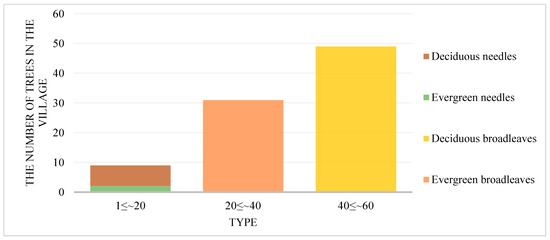 The existing trees on the main tourist routes in Bulao Village show a large proportion of deciduous broad-leaved trees, accounting for 55.06%. The seasonal changes on the main roads are abundant (Figure 7). Among them, medium-sized deciduous broad-leaved species account for the most significant proportion, 39.33% of the total, while small deciduous broad-leaved species account for 21.35% of the total. Large deciduous broad-leaved species account for 4.49% of the total; the overall distribution of street trees is relatively uniform, the vertical design distribution across the tree species is reasonable, the overall plant community structure is relatively stable, the proportion of coniferous species is relatively small, and the number of evergreen and deciduous coniferous trees only accounts for 10.11% of the total.