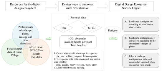By constructing a rural digital design ecosystem, this paper develops ecological villages through design empowerment, enhances the carbon sequestration benefits of plants in rural areas, and strengthens rural vitality. Combined with the carbon sequestration benefits of street trees in Bulao Village in Nanjing, the feasibility of the digital design ecosystem in rural planning was verified, and the ways and methods of rural environmental renewal were explored. Through the existing literature, the possibility of constructing a digital design ecosystem was deduced, the theoretical framework was derived, field research was carried out in the village of Bulao, the carbon sequestration benefit of street trees was quantified by the i-Tree model, and a structure chart of street trees, including breast diameter, tree height, type, etc., was formed. There were 35 species of street trees in Bulao Village, belonging to 33 genera in 22 families, including 19 species of trees, a total of 312 trees, and 16 species of shrubs. The street trees’ total carbon sink benefit was equivalent to RMB 30,327.47, a single street tree’s average carbon sequestration benefit was RMB 96.86, and the average CO2 absorption was 164.64 kg. The average CO2 absorption and single benefit of elm trees were the highest, reaching 465.48 kg·plant−1 and 186.81 RMB·plant−1, respectively. The CO2 absorption (185.13 kg) and the average benefit per plant (RMB 109.48) of the camphor tree were lower than those of the elm. However, because their number far exceeded that of elms, their total carbon sequestration benefit contribution was the highest, reaching RMB 25,837.28, accounting for 85.19% of the total benefit. In addition, the contribution rates of elm and willow’s total annual carbon sequestration benefits were also relatively high, reaching RMB 747.24 and RMB 710.04, respectively, accounting for 2.46% and 2.34% of the total benefits. This paper uses the digital design ecosystem’s theoretical framework to quantify street trees’ carbon sequestration benefits through field research. It optimizes and improves the plant allocation of parking lots in Bulao Village from the ecology and carbon sink perspectives. Practice shows that inheriting the connotation values of rural culture, improving the quality of the rural environment, and increasing residents’ and tourists’ sense of belonging and identity to the countryside are conducive to jointly promoting sustainable rural development against the background of “dual carbon”. Combining art design with quantitative scientific methods of ecological environment indicators provides a reference for future rural development.