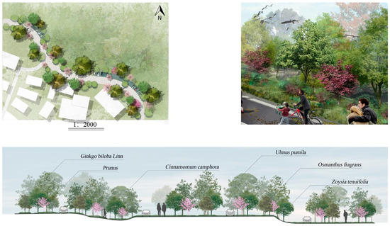 The first design involves functional plant clusters based on the plants’ carbon sequestration capacity (Figure 11). According to the i-Tree calculation results, large trees can be selected from Ulmus pumila L, Salix, Pinus, and Cinnamomum camphora, which provide CO2 absorption of more than 185 kg·−1 per plant, and the rest of the plants can be selected from Osmanthus fragrans, Ginkgo biloba, and Prunus serrulata, which are medium-sized trees with CO2 absorption of more than 92.74 kg−1. These tree species can be seen to have high carbon sink benefits in the quantitative results of this study.