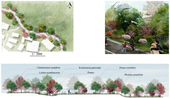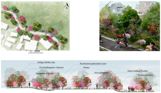 The second design involves ornamental plant clusters dominated by seasonal plants (Figure 12). From the perspective of plant color, the digital design ecosystem selected the Koelreuteria paniculata Laxm and Ginkgo biloba as large trees. Osmanthus fragrans, Prunus serrulata, Prunus cerasifera Ehrhart, Malus halliana, Acer palmatum Thunb, and Prunus cerasifera as small ornamental trees according to the existing tree species in the village of Bulao; and flowering plants such as Iris tectorum Maxim to improve the ornamental nature of plants on both sides of the road. The landscape of the street trees on both sides changes accordingly with the season.