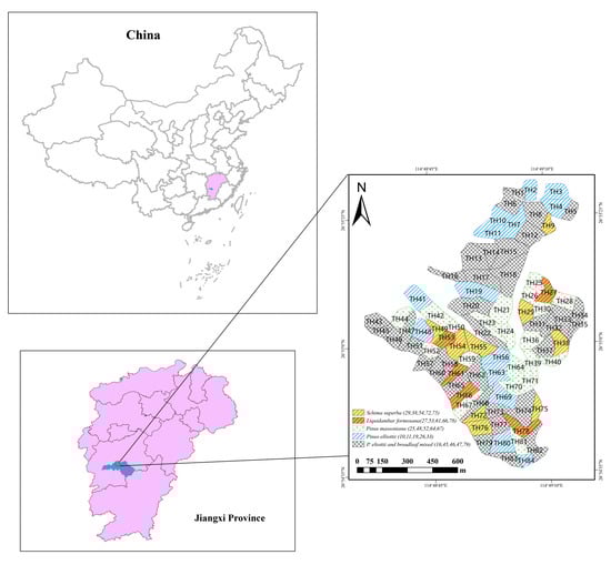 In each stand, we set up a 20 m × 20 m plot for vegetation and soil sampling, with a total of 30 plots sampled []. The spatial distribution of the sampling plots is shown in Figure 1, and the plots were away from adjacent plots (at least 100 m). The basic information of each plantation type is shown in Table 1. In each plot, five subplots of 2 m × 2 m were placed at the four corners and at the center of each major plot to enumerate the shrubs and small regeneration trees. To measure the litter and herbaceous biomass, a 1 m × 1 m subplot was placed inside each shrub plot []. A total of 150 shrub and herb plots, and 150 litter plots were used to record the shrub, herb, and litter biomass data. The fresh weights of the herbs were obtained by harvesting and weighing them directly in the field. The plot location, tree species, diameter at breast height, and tree height were recorded. Trees with a diameter at breast height ≤ 5 cm were considered small regeneration trees []. The plant species, basal diameter, height, and coverage were recorded for each subplot. Subsamples were taken back to the laboratory and oven-dried to a constant weight at 65 °C. The water contents were calculated and used to convert the fresh weight to the dry weight. The Simpson dominance index (SDI), Shannon–Wiener diversity index (SWDI), Pielou’s evenness index (PEI), dominance index (DI), and Margalef’s richness index (MRI) were used to measure the plant diversity at each sample location [].