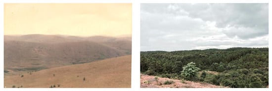 The research site is located in Taihe County, Jiangxi Province, China, at 26°54′~26°55′ N, 114°48′~114°49′ E (Figure 1), which has a typical subtropical humid monsoon climate that is hot and humid with an average annual temperature of 18.6 °C, annual rainfall of 1363 mm, and an average annual sunshine duration of 1756.4 h. The dominant soils are classified as Ferralsols (FAO/Unesco) which primarily developed from Quaternary red soil. The topography is typical of the Jitai Basin, with elevations ranging from 70 to 113 m, and the mean slope gradient of this area is approximately 15 °. Before the 1990s, the native evergreen broad-leaved forest had long since disappeared, with only a few arid and semiarid grasses (i.e., Setaria viridis, Imperata koenigii, Cynodon dactylon, Heteropogon contortus, Cymbopogon goeringii, and Arundinella anomala) scattered around [], and the soil organic matter content was extremely low (6.5 g/kg) due to the long-term intensity of woodcutting, thatch cutting, digging, and overgrazing (Figure 2). In 1991, a long-term Forest Restoration Experimental Project (FREP) with single and mixed tree species, including Schima superba, Liquidambar formosana, Pinus massoniana, P. elliottii, and mixed tree species of P. eliottii and broad-leaved trees, was established by our research group and the local government to rehabilitate the functions of the harshly degraded ecological ecosystem with the support of the local government. The FREP covered an area >133.33 ha. The initial planting space of the plantation is shown in Table 1. There was no additional management of these plantations except for the watering and weeding of trees at the beginning of planting to improve the survival rate. Afterwards, it was allowed to grow naturally without any human management activities.