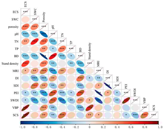 Correlogram plot showing the correlations between vegetation biomass production, soil carbon storage, ecosystem carbon storage, and environmental indices. * p ≤ 0.05; ** p ≤ 0.01 ***; p ≤ 0.0001. ECS, ecosystem carbon storage; SWC, soil water content; TN, total nitrogen; TP, total phosphorus; BD, bulk density; MRI, Margalef’s richness index; DI, dominance index; SDI, Simpson’s dominance index; PEI, Pielou’s evenness index; SWDI, Shannon–Weiner diversity index; VBP, vegetation biomass production; SCS, soil carbon storage. The same applies below.