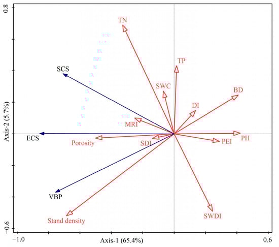 The linear relationships between vegetation biomass production, soil carbon storage, ecosystem carbon storage and other ecosystem indicators were determined by the Pearson correlation analysis (Figure 3). The results revealed that soil porosity and stand density were positively correlated with the ECS, VBP, and SCS; moreover, the pH was negatively correlated with the ECS, VBP, and SCS. BD was significantly negatively correlated with the VBP and ECD. TN and MRI were significantly positively correlated with the SCS and ECD. SWDI and PEI were negatively correlated with the SCS and ECD.