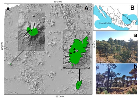 Location of the two study areas. (A) From left to right, the Jocotitlán and Tláloc mountains, highlighted with green polygons, respectively. Black triangles and circles represent sampling sites within each mountain area. (B) Macro location of the study areas. General views of the forests studied (a,b).