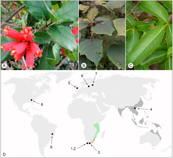 Host plants (A–C) and collecting sites (D) of five calacarine species. (A)—Burchellia bubalina (South Africa), (B)—Mallotus paniculatus (Vietnam), (C)—Searsia chirindensis (South Africa). (D)—Type localities of Viginticus searsiae n. sp. (1) and Calacarus burchelliae n. sp. (2) in South Africa, C. baviensis n. sp. (4) in Vietnam, C. pusillus (5) in Britain, locality of additional population of C. burchelliae n. sp. (3) and new findings of C. pusillus in Latvia (6) and northwestern Russia (7), Jiangsuacarus sp. in the USA (8), and Paracalacarus podocarpi in Brazil (9). Photos—P.E. Chetverikov. Approximate distribution areas of host plants B. bubalina, M. paniculatus, and S. chirindensis are shown with pink, dark gray, and green (respectively) according to data from [31,32,33,34,35].