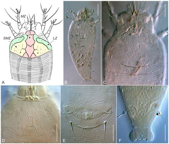 Prodorsal shields (A,C,D), dorsal view of female (B), external genitalia (E), and partially dissolved anal glands (outlined) (F) of Calacarus pusillus Pye 2012 from Great Britain ((A), redrawn from [12]) and Russia ((B,C)—DIC LM microphotographs) and Paracalacarus podocarpi Keifer 1962 from Brazil ((D–F)—DIC LM). Three zones of prodorsal shield are indicated in (A): medial zone (MZ, pink) flanked by admedian lines, lateral zone (LZ, green) along anterior margin of prodorsal shield, and submedian zone (SMZ, yellow) situated between MZ and LZ. Scale bars: (B)—30 µm, (C)—15 µm, (D)—20 µm, (E,F)—10 µm.