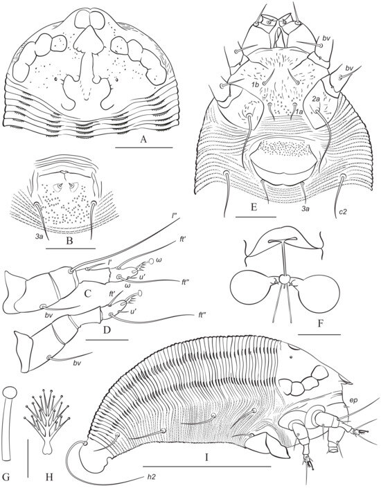 Drawings of Calacarus burchelliae n. sp. (A)—coxigenital area, (B)—prodorsal shield, (C)—male genital area, (D)—empodium I, (E)—tarsal solenidion I, (F)—leg I, (G)—leg II, (H)—female internal genitalia, (I)—semilateral view of female. Scale bar: (A,C)—15 µm; (B,F,G)—20 µm; (D,E)—4 µm; (H)—10 µm; (I)—115 µm.
