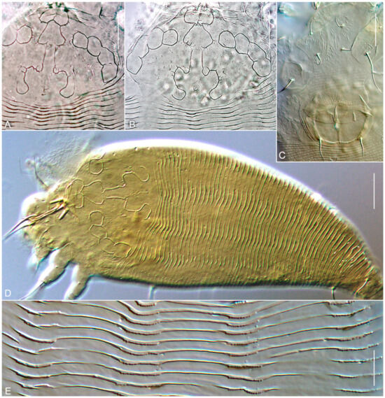PC LM (A,B) and DIC LM (C–E) microphotographs of Calacarus baviensis n. sp. (A)—male prodorsal shield, (B)—female prodorsal shield, (C)—female coxigenital area, (D)—dorsolateral view of a female, (E)—rows of denticulate plates on longitudinal opisthosomal ridges. Scale bar: (A,B,D) = 20 µm; (C) = 15 µm; (E) = 3 µm.