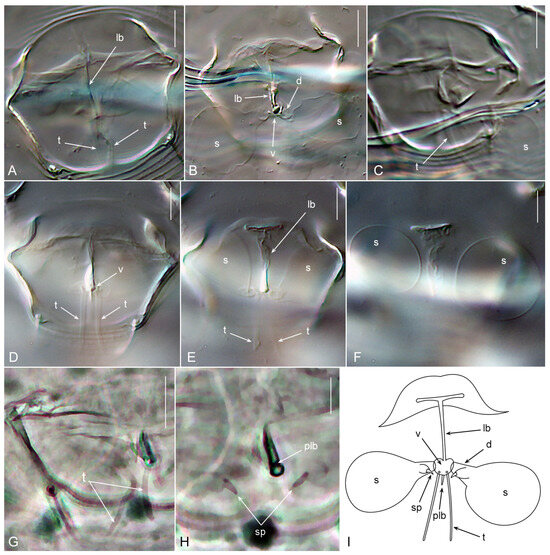 DIC LM (A–F) and PC LM (G,H) microphotographs of internal genitalia in four females (A+B; C; D+E+F; G+H) of Calacarus baviensis n. sp. and simplified scheme of spermathecal apparatus (I). Intact spermathecae (s) are drop-shaped, directed laterad, and slightly posteriad (B). In overflattened slide-mounted females, spermathecae may be displaced anteriad (E,F). Short funnel-like spermathecal duct (d) connects spermatheca medially with vestibulum (v), that is a small fovea in posterior genital cuticle covered by distal part of genital coverflap and leading to the genital slit formed by plates of longitudinal bridge (lb) (A,B,D,E). Two small thorn-like spermathecal processes (sp) are situated in distal spermathecal duct; they resemble a pair of tiny setae (similar to male eu), directed convergently midway, and can be observed near posterior part of longitudinal bridge (plb) (H). Two narrow genital tubules (t) extending backward from vestibulum (v); both of them can be seen in most intact females (A,D,E,G), and in deformed females only one of them can be rarely detected (C). Scale bar: (A–G) = 5 µm, (H) = 2 µm.