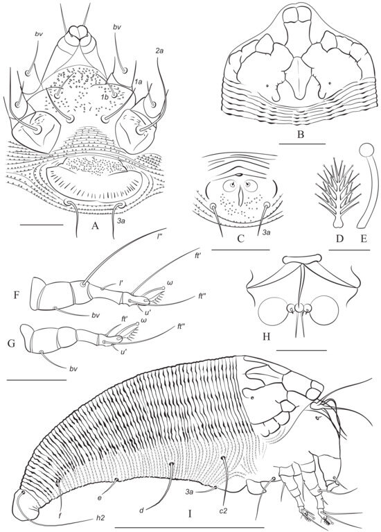 Drawings of Calacarus baviensis n. sp. (A)—prodorsal shield, (B)—male genital area, (C)—leg I, (D)—leg II, (E)—coxigenital area, (F)—female internal genitalia, (G)—tarsal solenidion I, (H)—empodium I, (I)—semilateral view of female. Scale bar: (A)—25 µm; (B,E)—15 µm, (C,D,F)—10 µm; (G,H)—5 µm; (I)—100 µm.