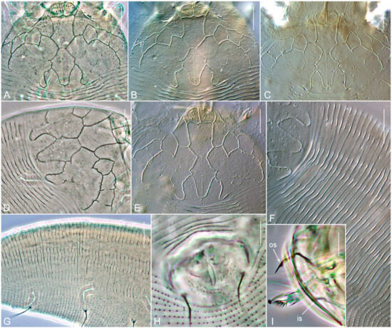 PC LM (A,D,G–I) and DIC LM (B,C,E,F) microphotographs of Calacarus burchelliae n. sp. (A–E)—variation of prodorsal shield ornamentation in females; (F,G)—longitudinal opisthosomal ridges, (H)—male external genitalia, (I)—oral (os) and infracapitular (is) stylets. Scale bar: (A–G) = 15 µm, (H) = 5 µm, (I) = 10 µm.