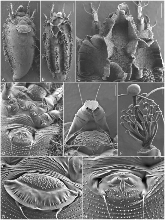 LT-SEM images of Calacarus burchelliae n. sp. (A,B)—dorsal (A) and ventral (B) view of entire female; (C)—prodorsal shield; (D)—male coxigenital area; (E)—ventral view of gnathosoma, (F)—empodium I and tarsal solenidion I; (G)—female external genitalia; (H)—male external genitalia. Photographs—C. Craemer. Scale bar: (A,B) = 20 µm; (C) = 10 µm; (D,E,H) = 4 µm; (F) = 1 µm; (G) = 5 µm.